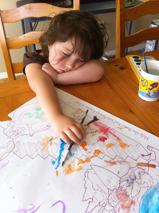 One of the biggest and best rewards for Scarlett is painting. The girl LOVES to paint. Grammy is really good at having fun pictures and things, so non-school days have been labeled "paint days". We have also been battling the sniffles around here making everyone a whole lot more tired, and as we painted I noticed her brush strokes getting slower and slower until it stopped moving all together.